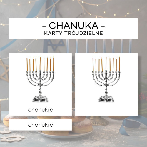 Karty trójdzielne Montessori ze słownictwem święta Chanuka do wprowadzenia nowych pojęć oraz do zwiększenia, wzbogacania i poszerzania słownictwa wg lekcji trójstopniowej Montessori.