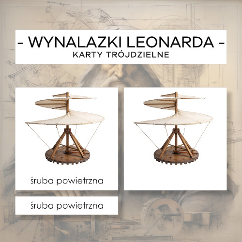 Karty trójdzielne Montessori z wynalazkami Leonarda da Vinci do wprowadzenia nowych pojęć oraz do zwiększenia, wzbogacania i poszerzania słownictwa wg lekcji trójstopniowej Montessori.
