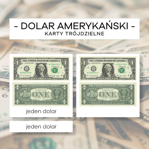 Karty trójdzielne Montessori z monetami i banknotami – dolar amerykański, do wprowadzenia nowych pojęć oraz do zwiększenia, wzbogacania i poszerzania słownictwa wg lekcji trójstopniowej Montessori.