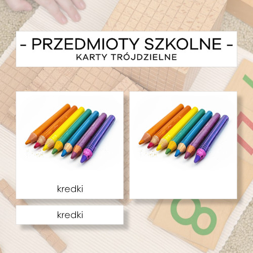 Karty trójdzielne Montessori z przedmiotami codziennego użytku w szkole i przedszkolu do wprowadzenia nowych pojęć oraz do zwiększenia, wzbogacania i poszerzania słownictwa wg lekcji trójstopniowej Montessori.