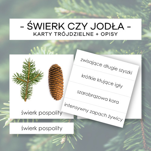 Karty trójdzielne Montessori z porównaniem świerku, jodły i sosny do wprowadzenia nowych pojęć oraz do zwiększenia, wzbogacania i poszerzania słownictwa wg lekcji trójstopniowej Montessori.