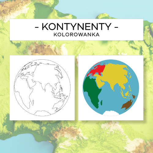 Pakiet zawiera 2 karty do kolorowania i 2 karty kontrolne z mapą przedstawiającą wszystkie kontynenty.