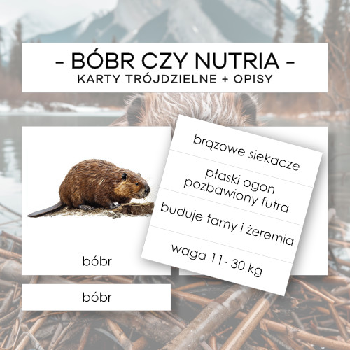 Karty trójdzielne Montessori z porównaniem bobra i nutrii do wprowadzenia nowych pojęć oraz do zwiększenia, wzbogacania i poszerzania słownictwa wg lekcji trójstopniowej Montessori.