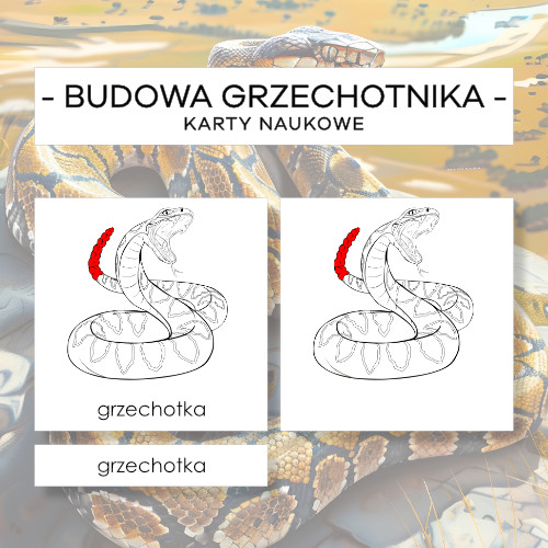 Karty naukowe Montessori z budową grzechotnika do wprowadzenia nowych pojęć oraz do zwiększenia, wzbogacania i poszerzania słownictwa wg lekcji trójstopniowej Montessori.