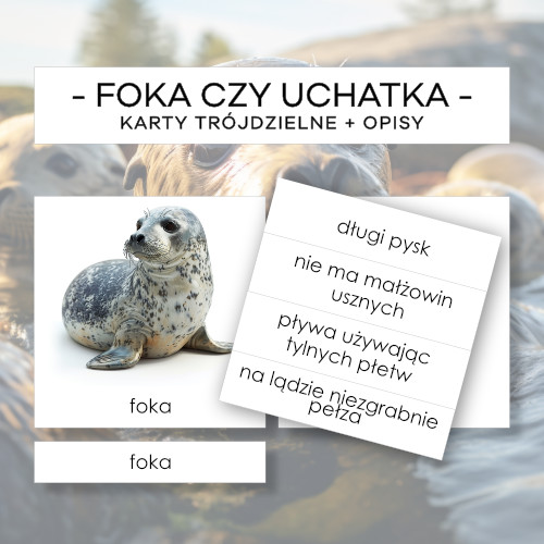 Karty trójdzielne Montessori z porównaniem foki i uchatki do wprowadzenia nowych pojęć oraz do zwiększenia, wzbogacania i poszerzania słownictwa wg lekcji trójstopniowej Montessori.