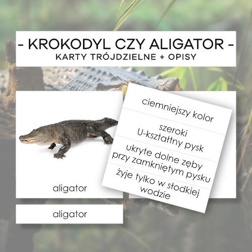 Karty trójdzielne Montessori z porównaniem krokodyla i aligatora do wprowadzenia nowych pojęć oraz do zwiększenia, wzbogacania i poszerzania słownictwa wg lekcji trójstopniowej Montessori.