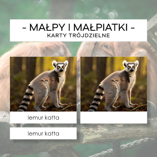 Karty trójdzielne Montessori z małpami i małpiatkami do wprowadzenia nowych pojęć oraz do zwiększenia, wzbogacania i poszerzania słownictwa wg lekcji trójstopniowej Montessori.