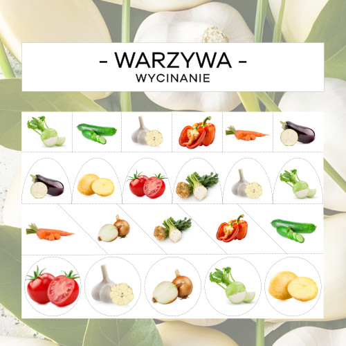 Zestaw zawiera jedną kartę A4. Na planszy znajdują się 4 paski z warzywami.